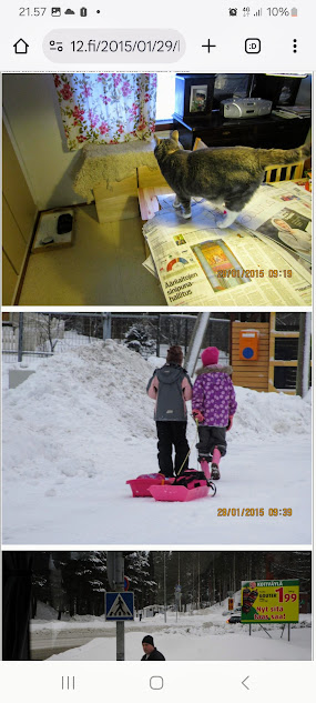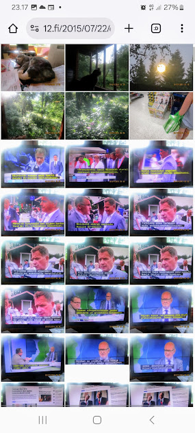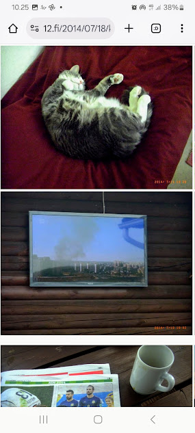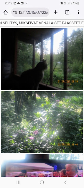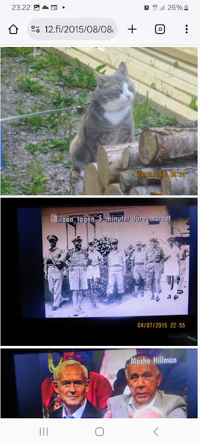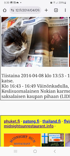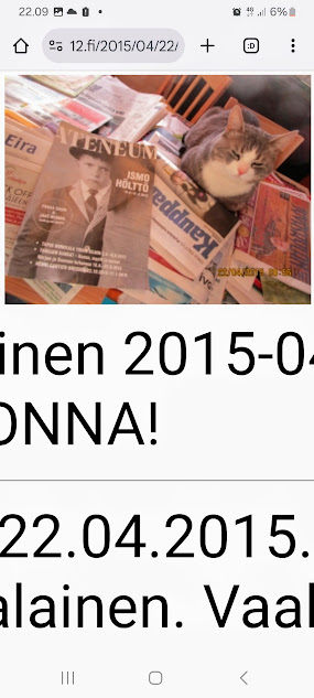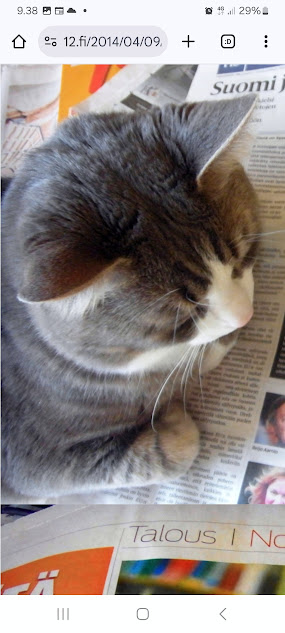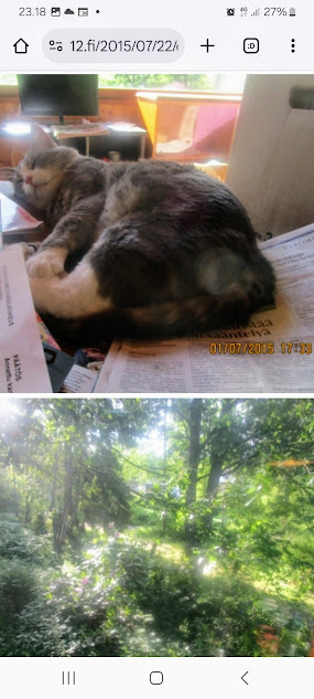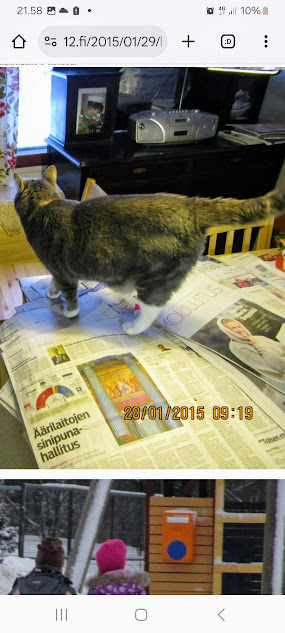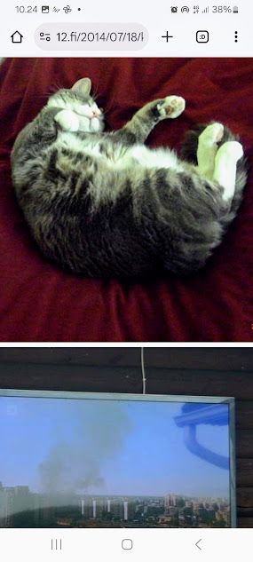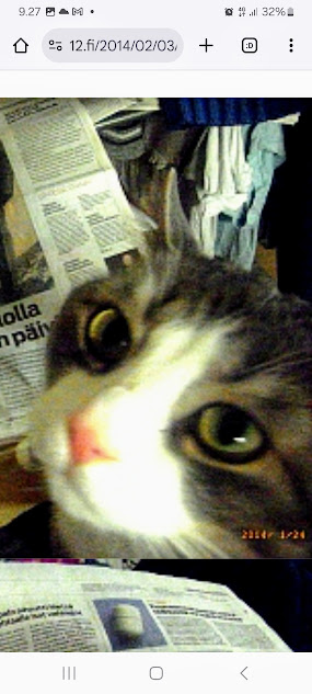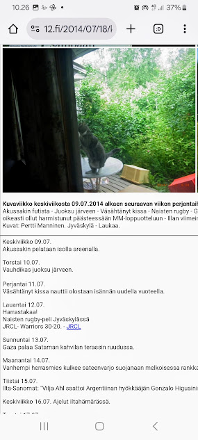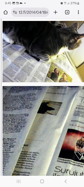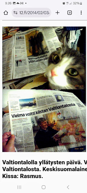 Helkingin Sanomat - nro 3100 - Torstai 26.6.2025. - Arkisto. - Rasmuksen matkassa 17 vuotta. Kiitos. Lue! - 2008 - 2009. Täällä - 2010 - 2011. Täällä - 2012 - 2013. - Täällä --- Arkisto. 3.2.2014. Valtiontalolla yllätysten päivä. Vielma voitti kiistan Valtiontalosta. Keskisuomalainen perjantaina 24.01.2014. Kissa: Rasmus. Kuvat: Pertti Manninen. Isonna! - 9.4.2014. "Suomi joutuu muuttamaan tietolainsäädäntöään". Keskiviikkona 09:29 - 15:57 HS tietolainsäädännöstä - Keslisuomalainen Nokian karmeasta virheestä - Agricolan muistamista Laukaan kunnantalolla - Pinkki mopo kaartaa saksalaisen kaupan pihaan (LIDL). Kuvat: Pertti Manninen. Keski-Suomi. Jyväskylä ja Laukaa. Isonna! - 18.4.2014. "... kun Rasmuskin siinä oleili hollilla." Keskisuomalaisen ja muidenkin lehtien tv-kriitikko Marko Ahonen kirjoitti Pitkäperjantain tv-ohjelmista otsikolla "Surujuhla ilman surua". Hän vei kynän kädestäni. Kun aamulla tutkailin ohjelmistoa niin Helsingin Sanomista kuin Keskisuomalaisestakin, niin en mitään löytänyt. Ajattelin mielessäni, miksi ei voitaisi esittää joka pääsiäinen Pasolinin "Matteuksen evankeliumia", jonka olen nähnyt vuosikymmenten aikana ainakin kymmenen kertaa. Kanavia Ylelläkin on ihan riittävästi saada se johonkin rakoseen sovitettua, mielestäni. Päätin sitten yrittää etsiä sen jostakin kätköstä, DVD:n olen hankkinut joku vuosi sitten jostain alennusmyynnistä. Ohjelmakarttaa aikani tutkisteltuani, pääsin sitten sivun eteenpäin ja hämmästykseni oli suuri: toimittaja Marko Ahonen kirjoitti samasta aiheesta ja eihän siinä sitten kannattanut kuin kiireesti kuvata sivu, kun Rasmuskin siinä oleili hollilla. Myöhemmin hain paremman kameran ja tallensin artikkelin. Kuvat perjantaina 2014-04-18 klo 07:05 ja 07:15. - 24.7.2014. "Väsähtänyt kissa nauttii olostaan isännän uudella vuoteella." Kuvaviikko keskiviikosta 09.07.2014 alkaen. Perjantai 11.07. Väsähtänyt kissa nauttii olostaan isännän uudella vuoteella. Sunnuntai 13.07. Gaza palaa Sataman kahvilan terassin ruudussa. Suomalainen Vilja ei varmaankaan oikeasti ollut harmistunut päästeessään MM-loppuotteluun. Kuvat: Pertti Manninen. Laukaa. - 24.7.2014. "Kissa pöydällä! Rasmus raapii ikkunaa päästäkseen sisätiloihin." Kuvaviikko keskiviikosta 09.07.2014 alkaen seuraavan viikon perjantaihin 18.07.2014. Torstai 17.07. Kissa pöydällä! Rasmus raapii ikkunaa päästäkseen sisätiloihin. Torstai 17.07. Kissa pöydällä! Rasmus raapii ikkunaa päästäkseen sisätiloihin. Perjantai 18.07. Ravikuningas viettää eläkepäiviään Laukaan vihreällä niityllä. Kuvat: Pertti Manninen. Laukaa. -l 9.8.2014. "Rasmus-kissa nukahtamaisillaan juomakuppinsa viereen tv:n lähettäessä ohjelmaa Tove Janssonin elämästä tutun musiikin soidessa." Tove Jansson 100 vuotta tänään. Kuva: Rasmus-kissa nukahtamaisillaan juomakuppinsa viereen tv:n lähettäessä ohjelmaa Tove Janssonin elämästä tutun musiikin soidessa. Perjantaina 08.08.2014 klo 18:46. Kuva: Pertti Manninen. Isonna! Katso myös! Joulukuu 2013. "Unelma valkeasta joulusta" - "Ja aamulla ..." Kuvat Mitäs tämä on? - Mutta peikko kulta, miten sait nelosen käytöksestä? Kuvasarja - 29.1.2015. "Rasmus jää kotiin nukkumaan." Matkalla Suomessa keskiviikkona 28.01.2015 Keski-Suomesta Pirkanmaalle 0-kelissä. Rasmus jää kotiin nukkumaan - Koulutytöt vetävät reppupulkkiaan - Mies ja makkaramainos. Kuvat: Pertti Manninen 2015-01-28 keskiviikkona 09:10 - 12:42 matkalla Laukaasta ensin Koivurannan bussilla Jyväskylään ja sitten 9-tietä pitkin Tampereen Kalevaan. Matka jatkui sitten Tampereen Hervannan kautta Loimaalle ja Humppilaan ja takaisinkin lähtöpisteeseen, mutta se on jo sitten ihan oman tarinansa. - 22.4.2015. "LEHTIKATSAUS." HUHTIKUU 2015. LEHTIKATSAUS. VAALIT. ÄÄNEKOSKI. KUVAT Tiistai 21.04.2015. ISO NRO - METRO Kuvat: Pertti Manninen 2015-04-22 aamulla. ISONNA! -l 19.6.2015. "Rasmus-kissakin on erityisen kiinnostunut tästä otuksesta, jonka hän näkee ensimmäistä kertaa elämässään." KESÄKUU 2015. "KUN PEURA KESKEYTTI ILLAN UUTISLÄHETYKSEN ..." KUVASARJA. Ylen uutislähetyksessä torstaina 18.06.2015 valtiovarainministeri Alexander Stubb kertoo Kreikan taloustilanteesta ja ex-pääministeri Esko Aho Venäjän kaupasta yleensä ja maa-alueiden kaupasta. Kuvatekstit ovat samaan aikaan lähetetystä toisesta ohjelmasta, jossa kerrotaan uusista energiamuodoista ja niiden kehittämisestä. Tykkikuva muistuttaa Waterloon taistelun 200-vuotispäivästä ja kirjakuvat Akateemisen kirjakaupan myymisestä Bonnierille. Peura saapuu ikkunan alle ja kiinnittää kaiken huomion tässä uudessa ympäristössä. Rasmus-kissakin on erityisen kiinnostunut tästä otuksesta, jonka hän näkee ensimmäistä kertaa elämässään. Uutislähetys jatkuu Juhannuksen liikenteestä kertovalla jutulla. Kuvat: Pertti Manninen. Uusimaa. Kirkkonummi. Kauhala klo 20:35 - 20:52. ISONNA! https://www.nettisanomat.com/2015/06/19/etusivu.html 20.6.2015. "JUHANNUSAATTONA ENNEN ILTAA." KESÄKUU 2015. JUHANNUSAATTONA ENNEN ILTAA. 39 KUVAA. Kuvat: Pertti Manninen. Ilta-Sanomat ja Iltalehti torstai 18.06.2015. Uusimaa. Kirkkonummi. Lapinkylä ja ympäristö perjantai 19.06.2015 klo 05:06 - 14:08. ISONNA! - 7.22.2015. "KISSAN NIMI ON RASMUS, JOKA NUKAHTAA PAPEREIDEN PÄÄLLE JA KATSELEE KUUTA." HEINÄKUU 2015. PRESIDENTTI SAULI NIINISTÖN SELITYS, MIKSEIVÄT VENÄLÄISET PÄÄSSEET ETYK-JUHLAKOKOUKSEEN JA MUITAKIN KUVIA. 24 KUVAA. KISSAN NIMI ON RASMUS, JOKA NUKAHTAA PAPEREIDEN PÄÄLLE JA KATSELEE KUUTA. Kuvat: Pertti Manninen Ylen uutislähetyksestä teksteineen. Uusimaa. Kirkkonummi. Lapinkylä keskiviikko 01.07.2015 ja torstai 02.07.2015. ISONNA! - 8.8.2015. Rasmus väsähtää telakkauutisiin. Kuva. Pertti Manninen tiistaina 2013-01-15 09:13. HS: Telakalle haetaan pikaratkaisua- Keskisuomalainen: Telakkateollisuuden pelastajaa ei tunnu löytyvän. HEINÄKUU 2015. JUHLAA. TYÖTÄ JA HISTORIAAKIN ERÄÄNÄ HELLEPÄIVÄ