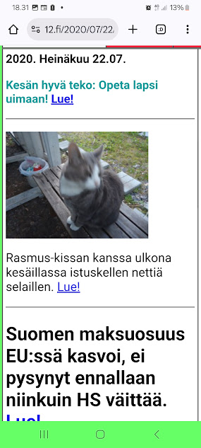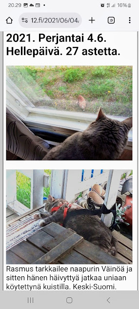 Helkingin Sanomat - nro 3103 - Maanantai 30.6.2025. - Arkisto. - Rasmuksen matkassa 17 vuotta. Kiitos. Lue! 2020 - 2021. Lue! 2008 - 2009. Täällä 2010 - 2011. Täällä 2012 - 2013. Täällä 2014 - 2015. Täällä 2016 - 2017. Täällä 2018 - 2019. Täällä 6.5.2020. "Rasmus-kissa mahan päällä! " ”Maskipää 5.5. 16:46 Tuominen sanoi: yleistä suositusta ei ole syytä antaa, koska meillä ei ole tarpeeksi yksityiskohtaista tietoa. Loppu olisi tullut kuulua: koska meillä ei ole tarpeeksi maskeja.” LAINAUS LOPPUU Viikkkosanomat. Pertti Manninen. Keskiviikko 06.05.2020 06:40 Rasmus-kissa mahan päällä! https://www.nettisanomat.com/2020/05/06/etusivu.html 21.6.2020. "Rasmus ylimmälläkin tasolla pitkästä aikaa, sen minkä olen havainnut." 2020. Kesäkuu 21.06, kesäpäivänseisaus. "Rasmus ylimmälläkin tasolla pitkästä aikaa, sen minkä olen havainnut ()." Kuva: Pertti Manninen lauantaina 20.06.2020 11:39. https://www.nettisanomat.com/2020/06/21/etusivu.html 11.7.2020. "... Rasmus-kissan nukkuessa jaloissa syötyään maukkaan ateriansa, ..." 2020. Heinäkuu 11.07. Kesän hyvä teko: Opeta lapsi uimaan! Lue! Jyväskylän tulipalo. Rakentajan SRV nimen unohtaminen. Pikainen tarkastelu muutamasta mediasta. Lue! Totta vai tarua? Palohälyttimet eivät toimineet Jyväskylän palossa. Lue! Viikkosanomat. Pertti Manninen. Lauantai 11.07.2020 18:13 Kirkkonummen Björkdalissa sateen aina vaan ropistessa, välillä oikeinkin kovasti ja Rasmus-kissan nukkuessa jaloissa syötyään maukkaan ateriansa, jossa oli ekstraa keitettyä seikalaa ilman suolaa." Lue! https://www.nettisanomat.com/2020/07/11/etusivu.html 12.7.2020. "... Rasmus-kissan ollessa nyt ihan mahan päällä." HS: Presidentti Sauli Niinistö ”aikoo jatkossakin ottaa kantaa myös asioihin, jotka eivät presidentin valtaoikeuksiin kuulu.” Luettelosta hän unohti Kikyn. Lue! Totta vai tarua 2. Loput palovaroitin-kommentit Jyväskylän tulipalossa. Lue! "Asiasta ja asian vierestä, mutta toivottavasti tästä jotain opitaan. Palopäällikön mukaan kuolleita olisi tullut, ellei heti paikalla ensimmäisenä ryhdytty ihmisiä pelastamaan pois palavasta rakennuksesta. Viikkosanomat. Pertti Manninen. Lauantai 11.07.2030 21:47 Kirkkonummen Björkdalissa sateen tauottua ja puron voimistunutta ääntä kuunnellen Rasmus-kissan ollessa nyt ihan mahan päällä. https://www.nettisanomat.com/2020/07/12/etusivu.html 22.7.2020. "Rasmus-kissan kanssa ulkona kesäillassa istuskellen nettiä selaillen." 2020. Heinäkuu 22.07. Kesän hyvä teko: Opeta lapsi uimaan! Lue! Rasmus-kissan kanssa ulkona kesäillassa istuskellen nettiä selaillen. Lue! Suomen maksuosuus EU:ssä kasvoi, ei pysynyt ennallaan niinkuin HS väittää. Lue! ... https://www.nettisanomat.com/2020/07/22/etusivu.html 19.8.2020. 2020. Elokuu 19.08. Lomalla Keski-Suomessa 1. Rasmus löysi heti paikkansa. Kuvat sunnuntai-illan hämärästä alkaen. Tiistaina sain telkkarin ja keskiviikkona hämmästelin näkymiä: sieniä ja heinäsirkkoja. Kiitos kyyditsijälle ja majapaikan järjestäjälle Keski-Suomen Laukaassa Peurunkajärven rannalla. Kuvat ja omakuvat Pertti Manninen 16.08.2020 20:51 - 19.08.2020 18:09. Osa 2 tästä. https://www.nettisanomat.com/2020/08/19/etusivu.html 22.8.2020. "... huomaan Rasmuksn nukkuvan omalla paikallaan." 2020. Elokuu 22.08. Lomalla Keski-Suomessa 3. Sää muuttui. Sateinen ja kolea päivä. Kylpylässä paljon lapsiperheitä. Keskisuomalaisessa päätoimittaja suorastaan herjaa tai lyö ainakin kuin vierasta sikaa vihreiden varapuheenjohtajaa sähköpyörähankkeista. Pekka Mervola intoutuu väittämään, että Helkamalta olisi vaadittu sähköpyörää mainoskäyttöön. Asiallisempi kirjoitus on Tommi Roimelan kolumni, jossa hän paheksuu, syystäkin, Helsingin kaupungin päätöstä poistaa ensi kesään saakka lasten ja nuorten salivuorot kouluilta. Näin siis Suomen rikkain kurittaa lapsiaan hankkimatta jotain tilalle, mikäli koulujen jumppasalien käyttö on pakko lopettaa koulun omien tarpeiden johdosta. Majapaikkaan palatessani huomaan Rasmuksn nukkuvan omalla paikallaan ja illalla saan sitten kuvattua lahden joutsenet. Ensimmäiset kuusi päivää lomaa on nyt vietetty, viisi kertaa kävin kylpylässä, paikat vetreytyvät kohta liikaakin. Pitäisikö välipäiväkin pitää? Kuvat Pertti Manninen lauantaina 22.08.2020 torstai 20.08.2020 18:47. Osa 1 tästä. - Osa 2 tästä. - Osa 3 tästä. https://www.nettisanomat.com/2020/08/22/etusivu.html 4.1.2021. Arkisto 2015. "KISSAN NIMI ON RASMUS, JOKA NUKAHTAA PAPEREIDEN PÄÄLLE JA KATSELEE KUUTA." Arkisto. Kuvasarja. HEINÄKUU 2015. PRESIDENTTI SAULI NIINISTÖN SELITYS, MIKSEIVÄT VENÄLÄISET PÄÄSSEET ETYK-JUHLAKOKOUKSEEN JA MUITAKIN KUVIA. KISSAN NIMI ON RASMUS, JOKA NUKAHTAA PAPEREIDEN PÄÄLLE JA KATSELEE KUUTA. Kuvat: Pertti Manninen Ylen uutislähetyksestä teksteineen. Uusimaa. Kirkkonummi. Lapinkylä keskiviikko 01.07.2015 ja torstai 02.07.2015. https://www.nettisanomat.com/2021/01/04/etusivu.html# maanantai20210104kuvasarja 31.3.2021. "Päiväunet. Rasmus keskiviikkona ..." 2021 Maalis Päiväunet. Rasmus keskiviikkona 31.3.2021 11:47. Kuva: Pertti Manninen. Sorkkarautaa tarvittiin keskiviikkona 31.3.2021 14:31. Kuva: Pertti Manninen. https://www.nettisanomat.com/2021/03/31/etusivu.html 11.5.2021. "Rasmus huilaa ja tarkkailee vilskettä." 2021. Tiistai 11.5. Hellepäivä. 25 astetta. 09:43 Rasmus huilaa ja tarkkailee vilskettä. 10:45 Veneet rannalla odottavat jo soutajiaan. Tiistaina 11.5.2021 Etelä-Suomessa Kirkkonummen Björkdalissa ja keskustassa ja sinne matkalla Vitträsk-järvi ohittaen. Kuvat: Pertti Manninen, https://www.nettisanomat.com/2021/05/11/etusivu.html 11.5.2021. "Rasmus huilaa lämmöstä nauttien." 2021. Tiistai 11.5. Hellepäivä. 25 astetta. 16:06 Galileon lämpömittarissa ylinkin 27 asteen pallo on laskeutunut ensimmäisen kerran tänä vuonna. Sisällä on siis 27 tai ylikin. Klassinen mittari näytti 29. 16:11 Rasmus huilaa lämmöstä nau